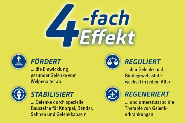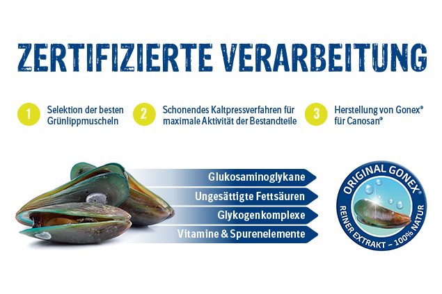 Mit dem in Canosan® enthaltenen Inhaltsstoff Gonex® mit aktivem Grünlippmuschel-Extrakt, beugt ihr Gelenkerkrankungen vor, beeinflusst den Gelenk- und Bindegewebsstoffwechsel positiv und unterstützt die Therapie von bereits fortgeschrittenen Krankheitsprozessen bei eurem Haustier. Gonex® enthält alle entscheidenden Bausteine für den Gelenkstoffwechsel und sorgt dafür, dass diese auch barrierefrei an ihren Bestimmungsort transportiert werden. Dadurch wird das Gelenk eures Tieres bestmöglich mit Nährstoffen versorgt und der Aufbau- und Reparationsprozess optimal unterstützt. Gonex® überzeugt hierbei durch einen einzigartigen 4-fach Effekt: