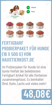 Wenn ihr das Menü nicht selber zusammenstellen möchtet, gibt es bei haustierkost.de® auch fertige Menüs. Hier findet ihr eine große Auswahl an Fleischsorten (Rind, Geflügel, Pferd oder Lamm), die mit verschiedenen Gemüse- und Obstsorten sowie Ergänzungsfuttermitteln versehen sind. Diese könnt ihr optimal als Basisfutter verwenden und je nach Belieben und Bedarf noch ergänzende Produkte hinzufügen.