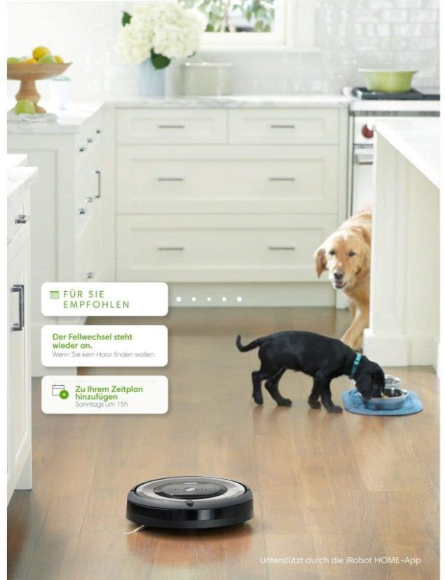 Der iRobot Roomba e5 hat einige tolle Features zu bieten. Er saugt nicht nur auf Knopfdruck, sondern kann auch vorher auf eine bestimmte Zeit programmiert werden. So beseitigt er selbstständig Tierhaare und anderen Schmutz auch wenn ihr gar nicht zuhause seid. Au0erdem lernt der Roboter eure Reinigungsgewohnheiten und gibt personalisierte Empfehlungen für die automatische Planung von Reinigungsaktionen. Die Dirt Detect-Sensoren machen den Roboter auf verschmutztere Bereiche in eurem Heim aufmerksam, etwa Orte mit hoher Besuchsfrequenz, und sorgen dafür, dass diese häufiger gereinigt werden. Außerdem schlägt er auch Zeiten vor, zu denen eure Wohnung möglicherweise häufiger gereinigt werden sollte – etwa zur Haarwechselsaison bei Haustieren oder in Zeiten mit erhöhtem Allergenaufkommen. Dank dreistufiger Reinigungskraft löst der Staubsauger auch hartnäckige Verschmutzungen. Hierfür sorgen zwei Gummibürsten für alle Böden mit extrastarker Saugleistung sowie ein spezielles Bürstenmodul. Der Staubsauger navigiert zielsicher um Hindernisse herum und kann mithilfe der automatisch aktivierten Virtual Wall auf bestimmte Bereiche begrenzt werden. Wenn der Akku während der Reinigung leer wird, kehrt der iRobot Roomba automatisch zu seiner Ladestation zurück. Bei Idealo.de bekommt ihr diesen Saugroboter für nur €!