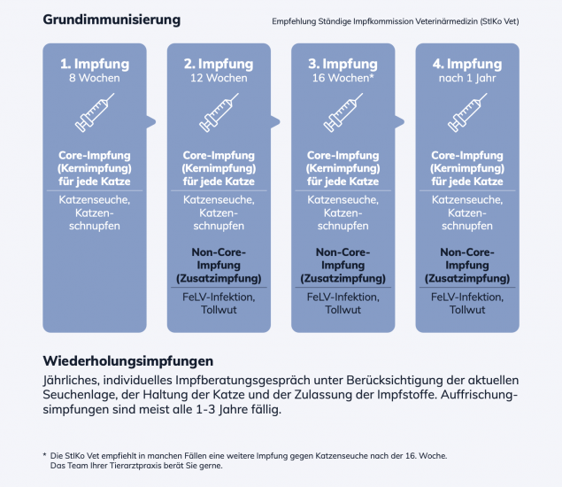 Die 0,5 ml Impfstoffe schützen gegen wichtige Erkrankungen wie Katzenschnupfen, Katzenseuche und die FeLV-Infektion. Neben dem breiten Schutz ermöglichen sie eine Grundimmunisierung von jungen Kätzchen bereits ab 8 Wochen, sind schnell wirksam und sorgen bei den von Experten unbedingt empfohlenen Impfungen (Core-Impfungen) für eine lange Immunität von bis zu drei Jahren nach der Grundimmunisierung. Studien zeigen, dass das kleinere Impfvolumen das Auftreten von Schwellungen an der Injektionsstelle reduziert. Dies stellt natürlich gerade bei der Impfung von kleinen Kätzchen einen großen Vorteil dar. Und gerade diese werden ja in den ersten Lebenswochen mehrfach geimpft.