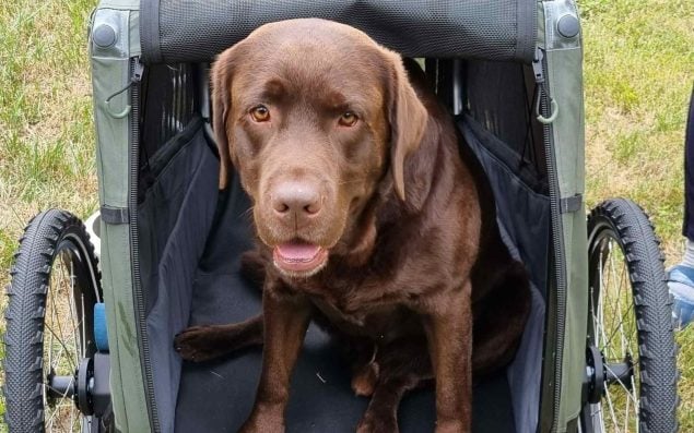 Labradorrüde Bruno hat sich zu Hause sehr gut an den Croozer Dog Fahrradanhänger gewöhnt. Familie Schmitt hat den Anhänger ohne Räder an den gewohnten Platz von Bruno gestellt und seine Matratze hineingelegt. Auch sein Futter hat er immer im Croozer bekommen. Schritt eins der Eingewöhnung hat also ohne Probleme funktioniert und Bruno ist nach kurzer Zeit gerne in den Anhänger gegangen. Bei der ersten kleineren Fahrt in der Umgebung ist Bruno auch direkt in den Anhänger gesprungen, die Fahrt über war er zwar ruhig, aber die Anspannung war ihm anzumerken. Während eines Urlaubs hat Brunos Familie dann eine Radtour gewagt. Sie haben einige kleine Pausen eingelegt, unter anderem an einem Fluss, wo Bruno dann auch baden durfte. Ziel war es die Anspannung durch Spaß und Spiel abzubauen. Leider war Bruno danach eher aufgeregt und wollte nicht mehr im Croozer bleiben. Laut der Familie ist Bruno ein Hund, der gerne kontrollieren möchte, was natürlich in dem Croozer bei der Fahrt etwas schwierig zu händeln ist. Hier hilft eine längere Eingewöhnungsphase und anfangs eher kürzere Fahrten, bis der Hund sich im Anhänger entspannen kann und begreift, dass er auch zwischendurch seinen Spiel- und Schwimmtrieb befriedigen kann.