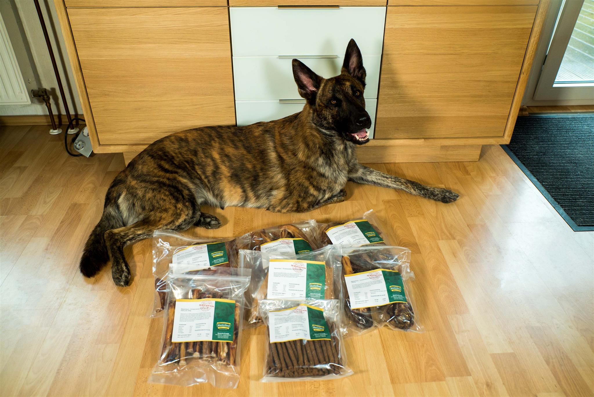 Zum Hundeversicherungs-Vergleich →Kauartikel eignen sich nicht nur hervorragend als gesunde und natürliche Ergänzung zum normalen Hundefutter und tragen außerdem zur Zahnreinigung bei, sondern sind auch sehr schmackhaft. Aus diesem Grund war es für meinen Holländischen Schäferhund Rüden Piet natürlich eine große Freude, dass er die Snacks von Masterfeed testen durfte. Wir haben von den Kauartikeln je eine Packung Putenhälse, Ochsenziemer mit Fleisch, Ochsenziemer S, Rinderstreifen, Rinderkopfhaut, Schweineohren und Lammsticks in einem großen Paket zum Probieren bekommen. Als Ergänzung war auch eine Packung des Masterfeed Meatlies Alleinfuttermittels mit Rindfleisch sowie Geflügel Drops enthalten.