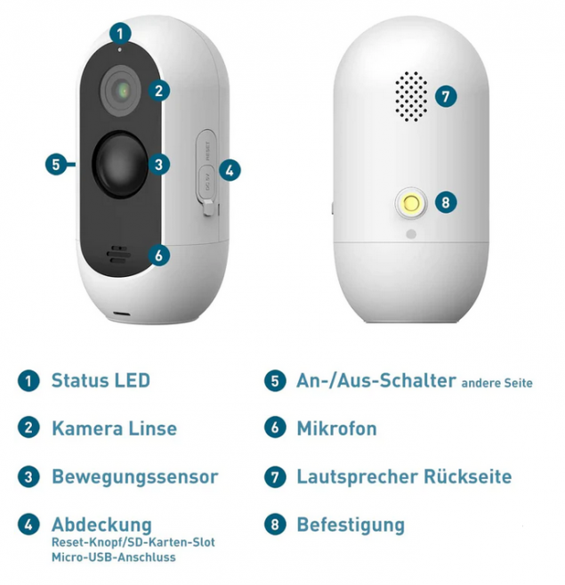 Bevor ihr die Kamera benutzen könnt, müsst ihr sie erstmal mithilfe eines Micro-USB-Kabels mit einem Netzstecker verbinden. Nach ungefähr einer Minute gibt die Kamera ein Signal von sich und die LED blinkt rot. Daran erkennt ihr, dass sich die Kamera mit dem WiFi Netzwerk verbunden hat.