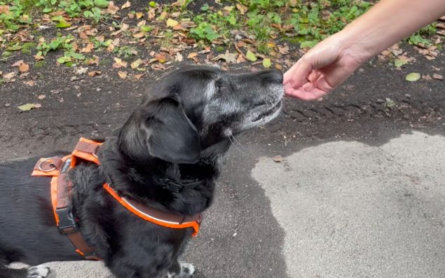Am nächsten Tag haben wir mit dem Training begonnen. Wir haben zuerst die niedrigste Vibrationsstufe eingestellt, um zu sehen, wie und ob Paula darauf reagiert. Da Paula ein sehr dickes Fell am Hals hat, hat sie keinerlei Reaktion gezeigt. Daher haben wir die Vibrationsstufe langsam und mit mehrmaligen Versuchen erhöht, bis sie schließlich bei Stufe 3 reagiert hat und zu uns geschaut hat. Genau das war auch unser Ziel. Sie sollte nach der Vibration zu uns schauen, damit wir ihr mit Handzeichen weitere Instruktionen geben können. Natürlich gab es nach dieser Reaktion direkt eines ihrer Liebslings-Leckerlis.